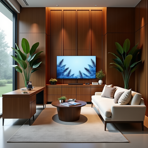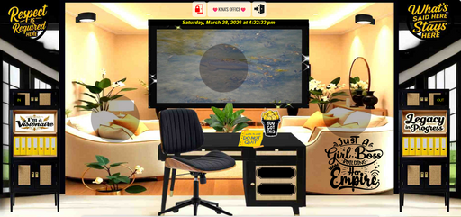 A warm, cinematic workspace known as Kina’s Office, designed with intention and creative clarity. The room blends soft lighting, layered textures, and natural greenery to create a grounded, inviting atmosphere. A large screen displays gently moving water, adding a calming sense of motion and presence to the space. The seating area behind the desk brings depth and comfort, giving the room a lived‑in, expressive feel. Every detail is curated to support focus, flow, and vision — a space where ideas land easily and creativity feels natural.